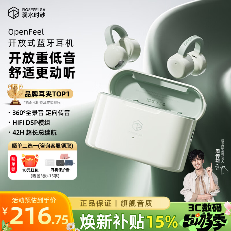弱水时砂【八仓现货】OpenFeel蓝牙耳机耳夹式真无线HIFi音质挂耳运动跑步通话降噪骨传导概念开放式 春芽绿/单次10h超长续航 高音质协议+LC3低延迟