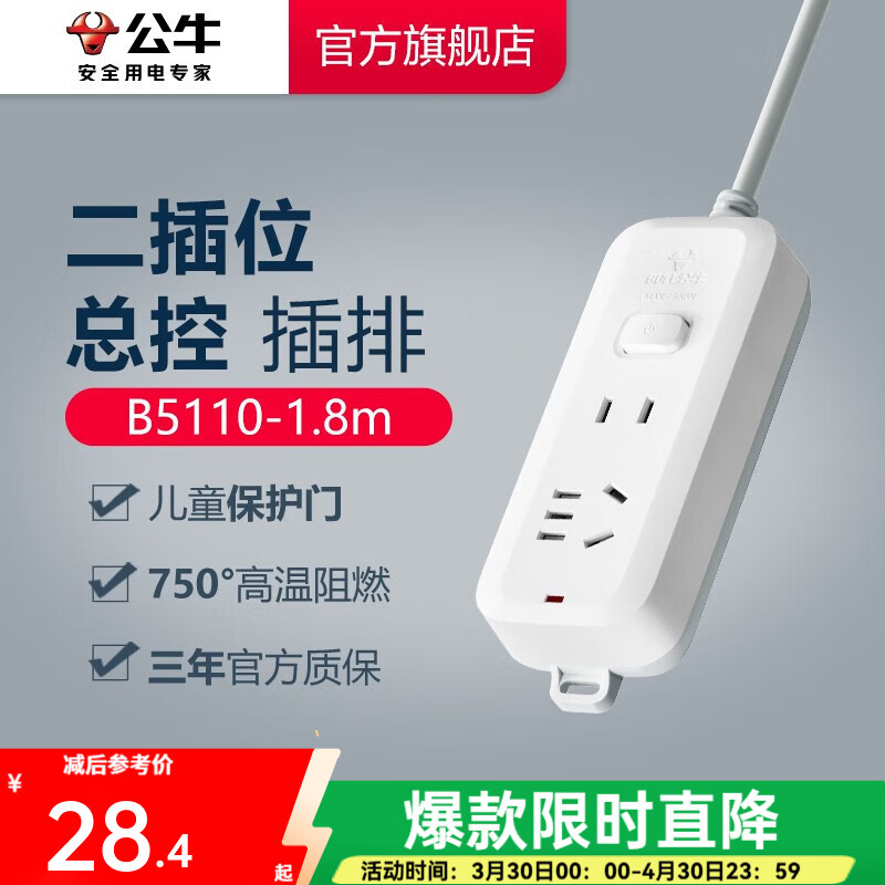 公牛(BULL) 插座/B5系列 带儿童保护门/新国标插座/排插 【2位】总控1.8米 GN-B5110
