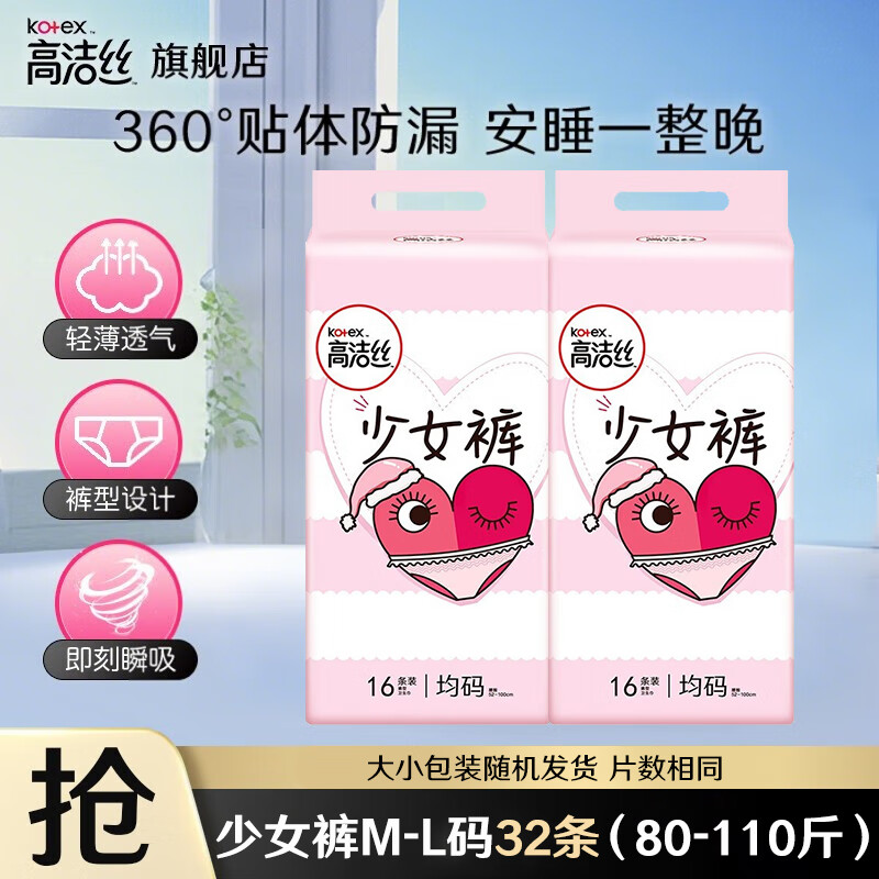 高洁丝(Kotex)夜用安睡裤 夜安裤少女裤型卫生巾姨妈巾组合码数可选 F码-均码 32条 80-110斤