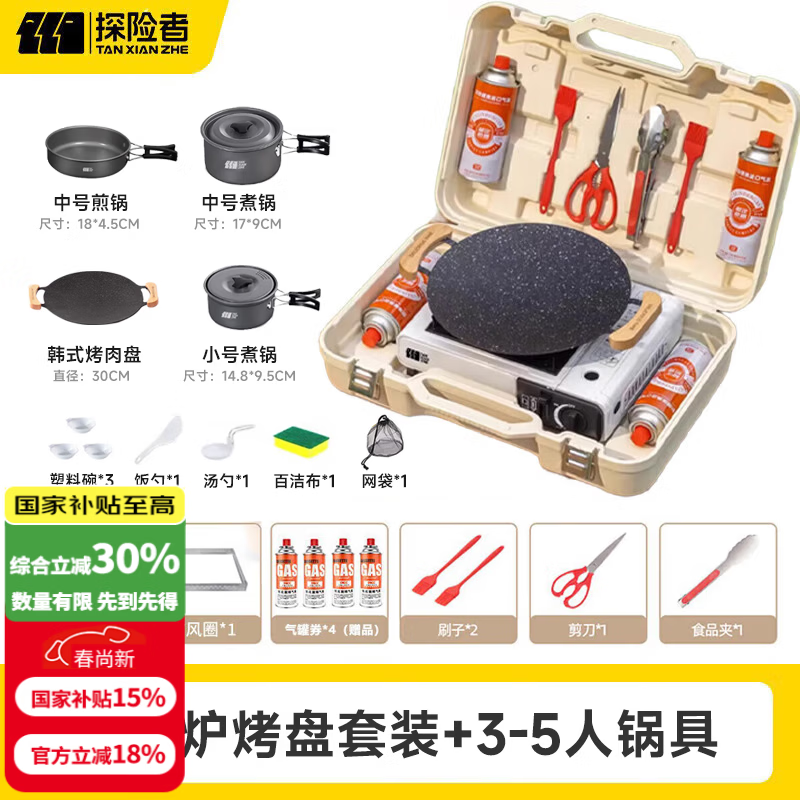探险者卡式炉户外卡式炉具套装防爆卡磁炉全套带锅烤盘露营野餐烧烤卡斯 卡式炉烤盘套装+3-5人锅具