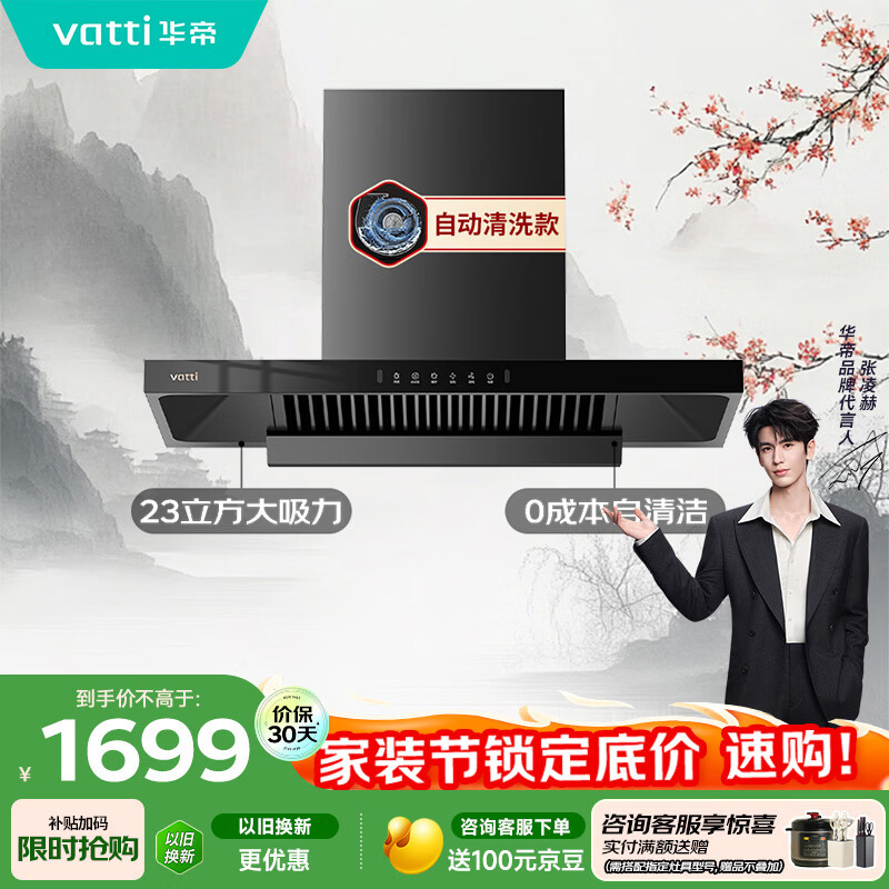 华帝官方抽油烟机【推荐搭配101D灶具】欧式家用23风量大吸力静音变频自动清洗一级能效i11143T