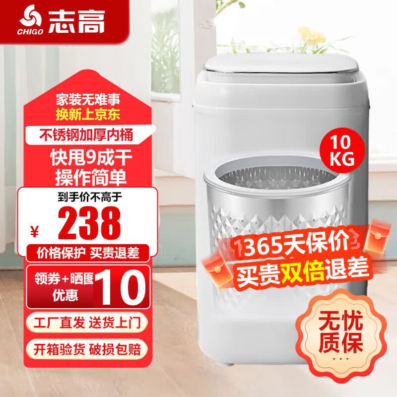 志高【热销Top1】脱水机单甩干脱水机干桶甩干机小型迷你家用甩干桶出租房宿舍大容量脱水桶烘干 10KG白盖【不锈钢桶加厚款】质保三年 波轮