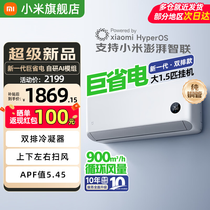 小米(MI)米家空调 1.5匹 巨省电 新一级能效 节能省电 变频冷暖家用卧室壁挂式自清洁舒适空调挂机 大1.5匹 一级能效 巨省电双排款【26款新品】