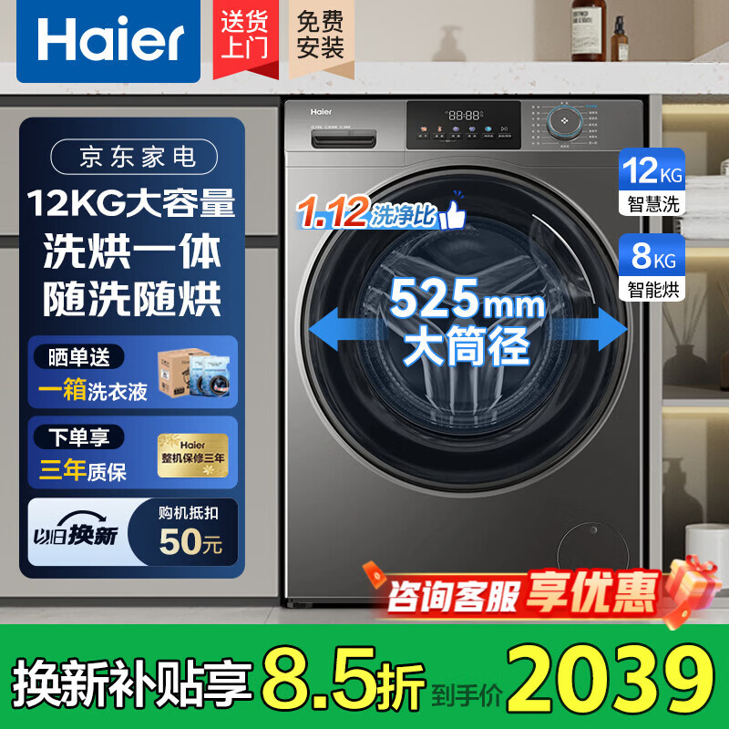 海尔滚筒洗衣机全自动10公斤带烘干洗烘一体一级能效超薄机身除菌螨以旧换新补贴 海尔50DS|品质销冠 滚筒洗烘 12kg