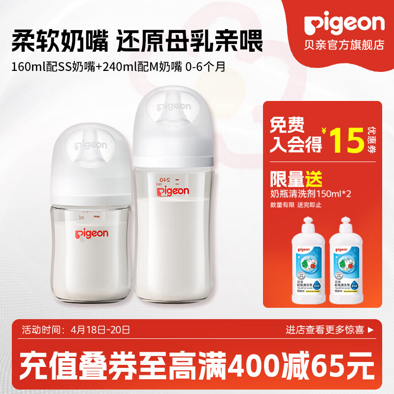 贝亲奶瓶 婴儿奶瓶 新生儿防胀气奶瓶 玻璃宽口径仿母乳亲喂感 新妈必买160ml+240ml 0-6个月