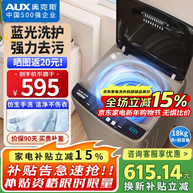 奥克斯(AUX)波轮洗衣机全自动 大容量洗衣机家用宿舍租房神器 【国补】 金色18KG洗脱容量/智能风干【蓝光抑菌】 波轮