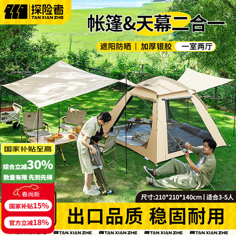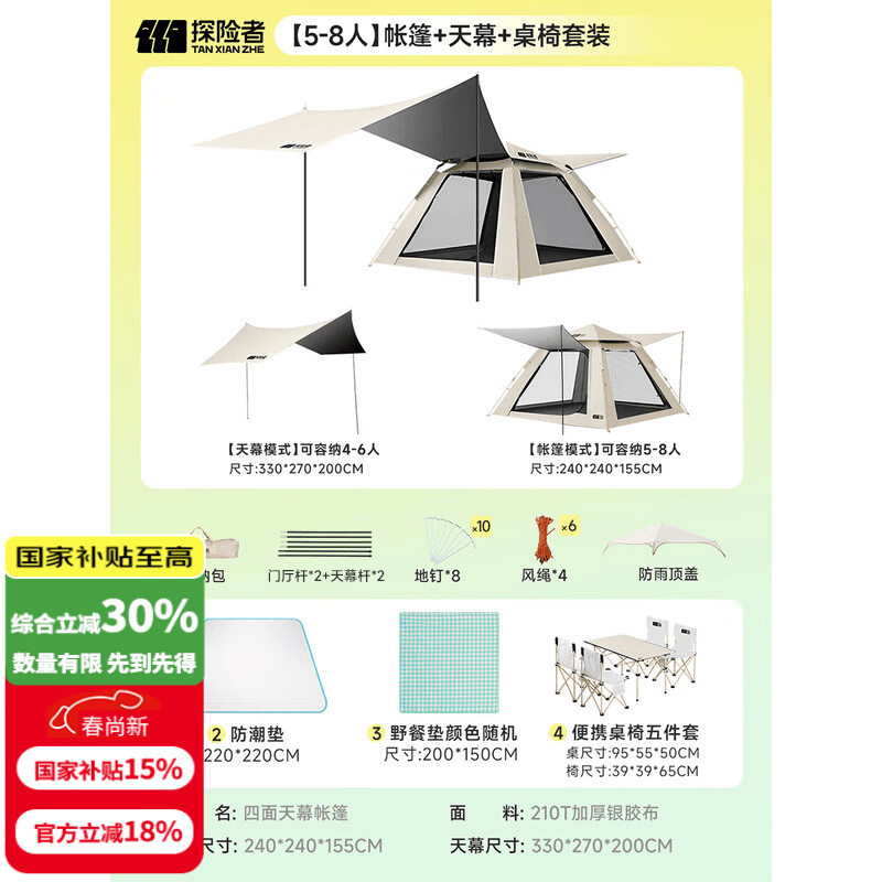 探险者(TAN XIAN ZHE)帐篷户外露营防雨过夜3人-4人速开便捷天幕二合一黑胶防晒帐篷 【5-8人】帐篷+天幕+桌椅套装