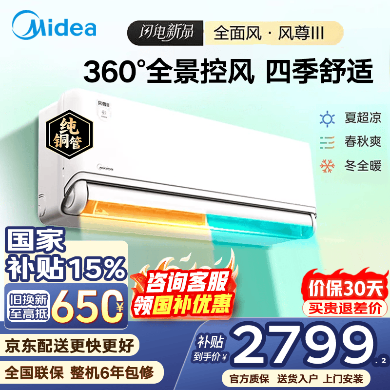 美的(Midea)空调挂机风尊二代Pro大1.5匹 新一级能效 变频节能冷暖两用壁挂式卧室空调防直吹APP智控 以旧换新 风尊 三代 大1.5匹 推荐新品 360°全景控风