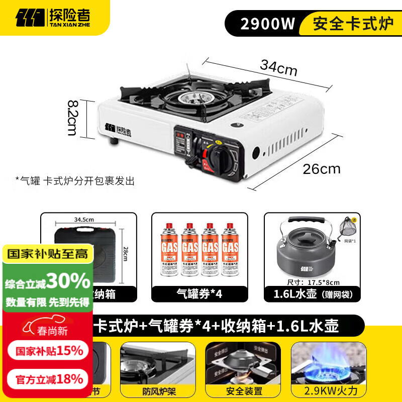 探险者(TAN XIAN ZHE)户外卡式炉露营炉具便携式野外煮火锅炉子卡磁炉全套带锅野餐套装 炉+箱+气券(赠品)*4+1.6L水壶