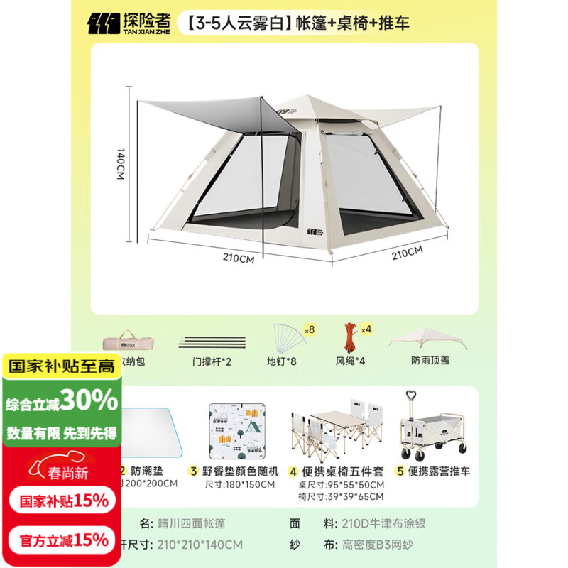 探险者(TAN XIAN ZHE)帐篷户外露营防雨过夜3人-4人速开便捷天幕二合一黑胶防晒帐篷 【3-5人云雾白】帐篷+桌椅+推车