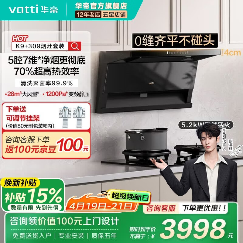 华帝(VATTI)K9烟灶套装【小飞翼Pro K9系列 】超薄顶侧双吸28风量大吸力自清洗烟灶联动抽油烟机灶具以旧换新 【三环匀火套装】K9+309燃气灶-咨询同价买309D定时灶 天然气
