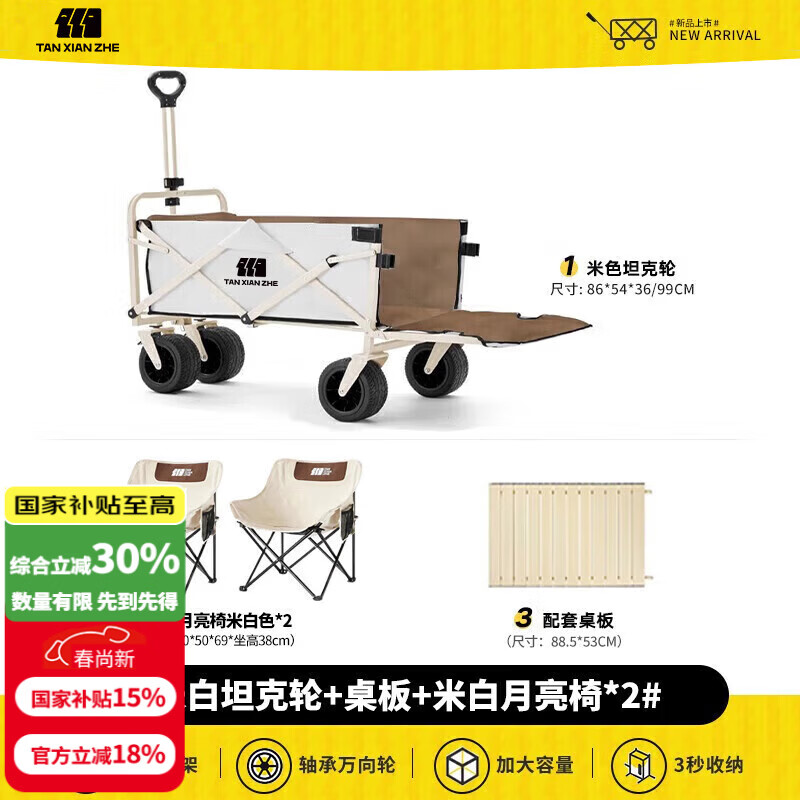探险者露营车折叠推车户外露营儿童小推车营地车拉年货小拖车聚拢型推车 350L 云峰白坦克轮+桌板+月亮椅*2