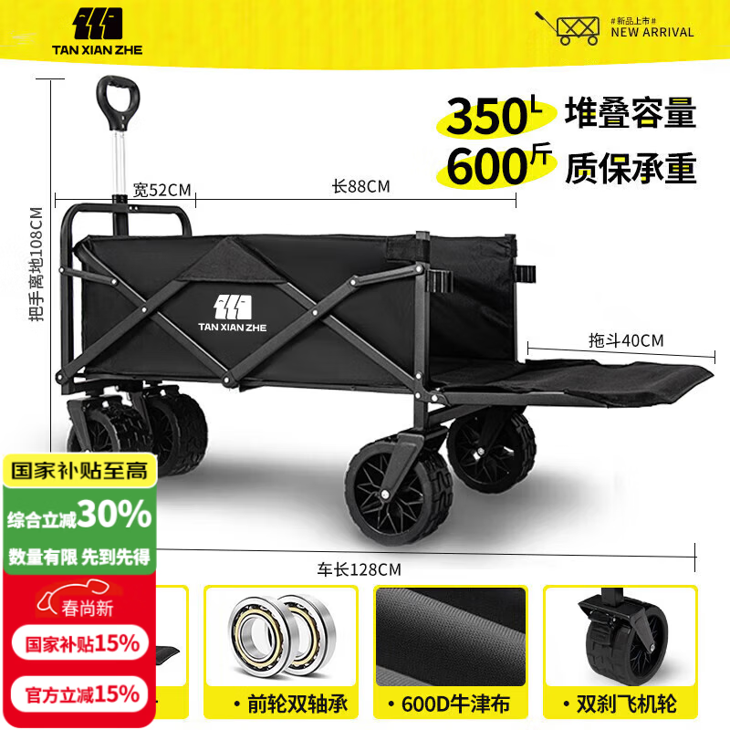 探险者露营车折叠推车户外露营儿童小推车营地车拉年货小拖车聚拢型推车 350L 曜石黑-双刹坦克轮+加粗钢管