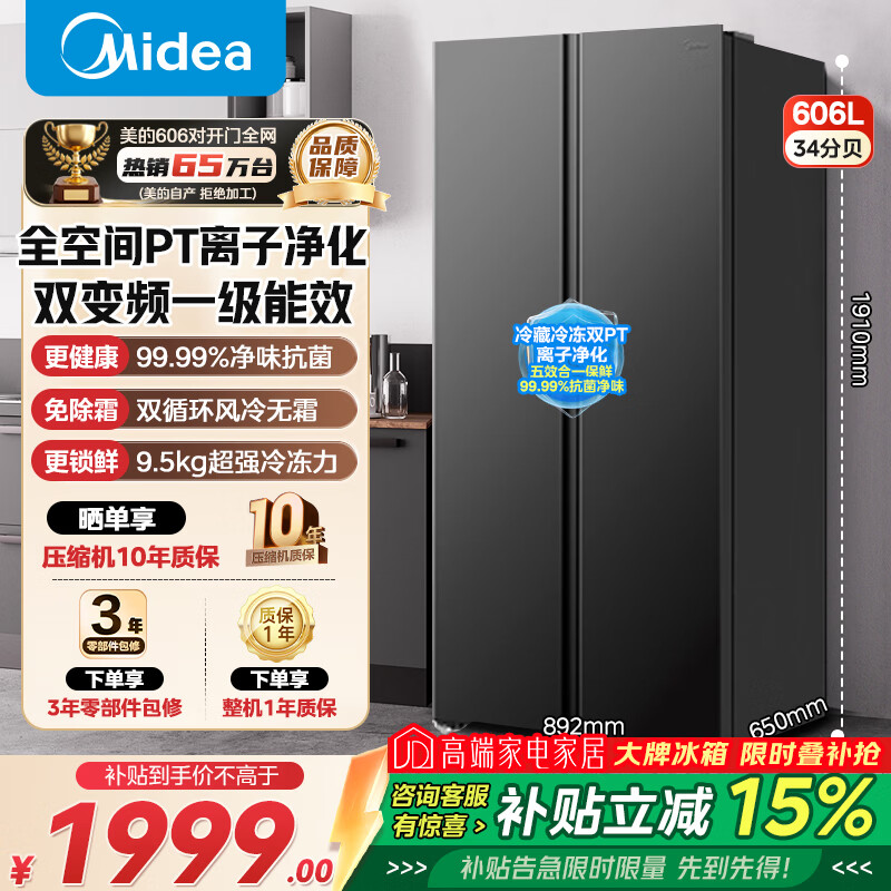 美的冰箱双开门对开门一级能效双变频节能风冷无霜保鲜超薄大容量家用电冰箱571+/601pro/606 606一级双变频全空间双PT净味