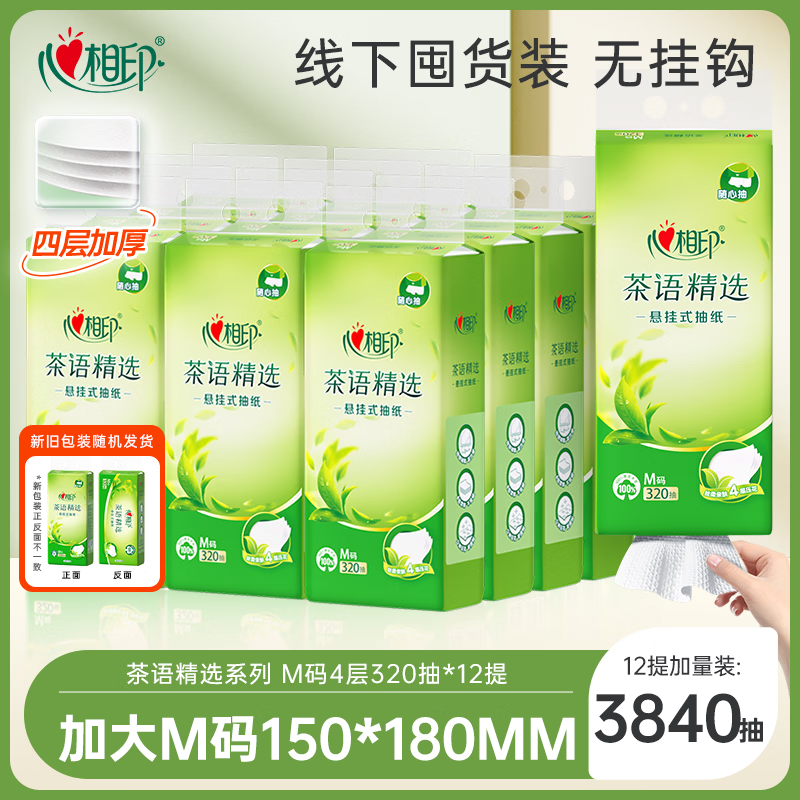 心相印抽纸悬挂式 茶语精选4层320抽*12提 大包挂抽面巾纸 囤货装无挂钩
