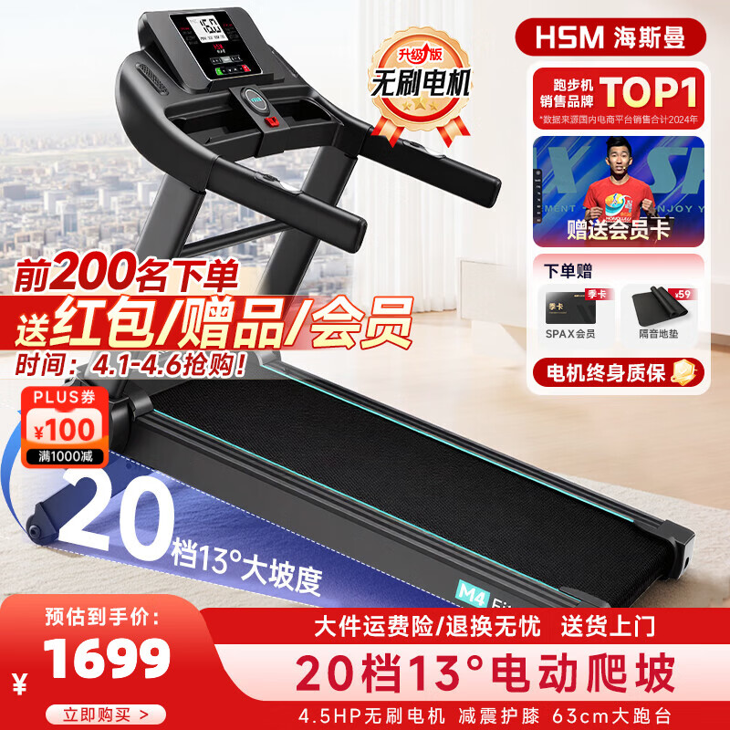 海斯曼M4跑步机家庭用爬坡升降坡度20档可调健身器械智能静音减震全折叠 【升级13°大坡度】4.5HP无刷电机/20挡电动爬坡 黑色