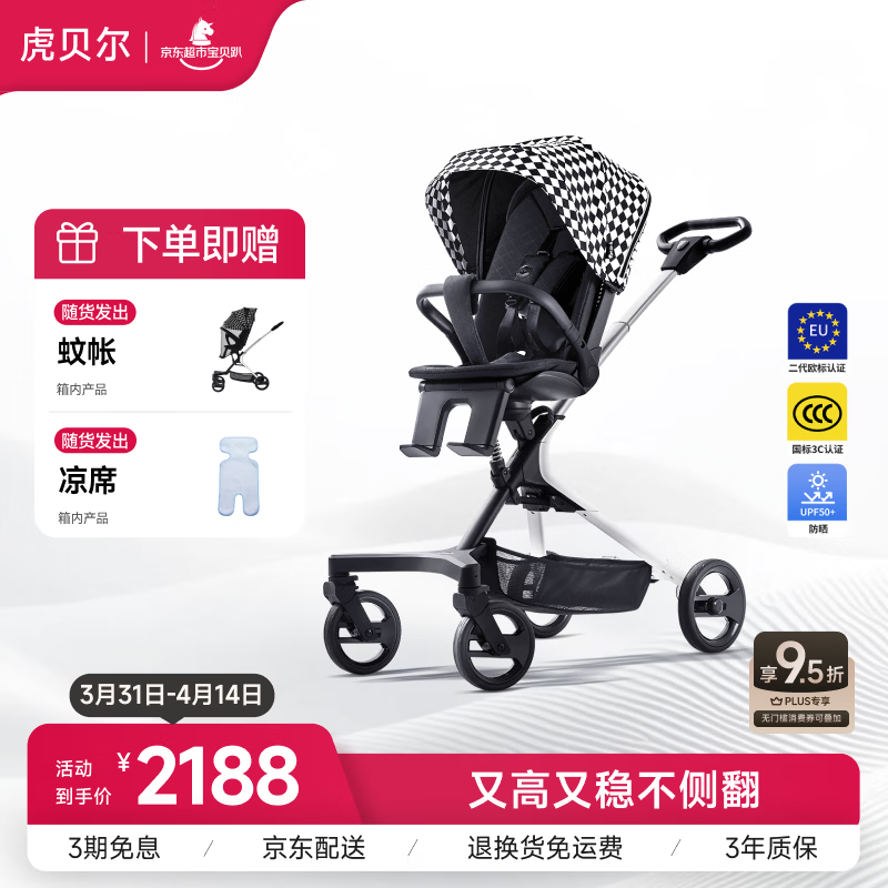 虎贝尔(HBR)遛娃神器轻便可折叠双向高景观可坐可躺婴儿推车城市漫步车黑白格