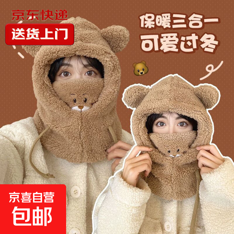 围脖秋冬款小熊帽子围巾一体口罩三合一毛绒加厚多功能护耳保暖 【咖啡色】保暖