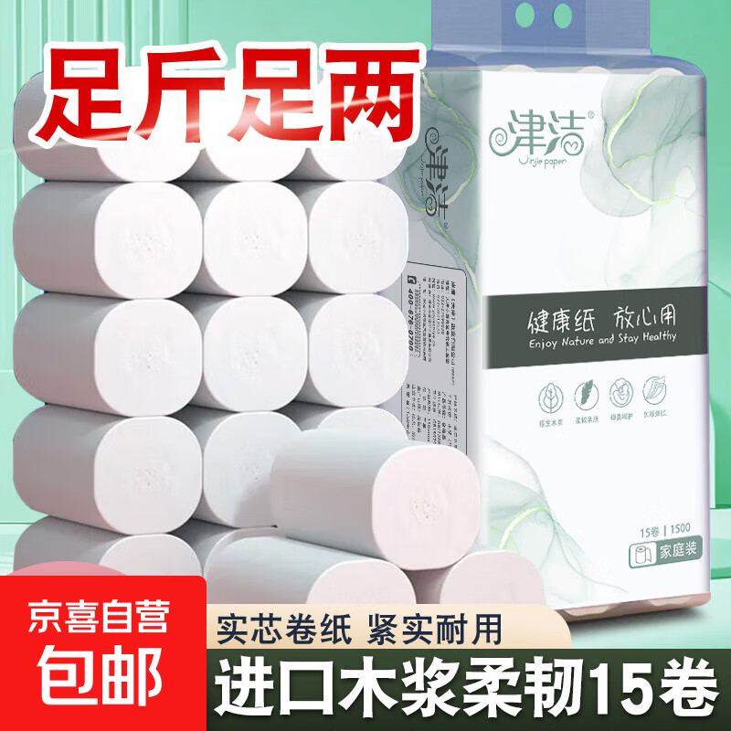 津洁 无芯卷纸【1.5kg/提】大卷卫生纸加厚家用厕纸纸巾卷筒纸 5层 98g/卷*15卷 家用卷纸1提装