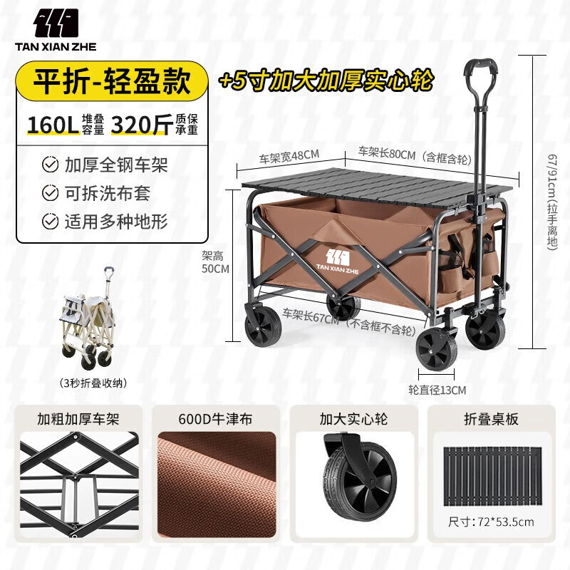 探险者(TAN XIAN ZHE)露营车儿童可躺户外推车野餐车露营装备折叠露营推车营地车买菜车 160L 淡栗棕【实心万向轮+桌板】
