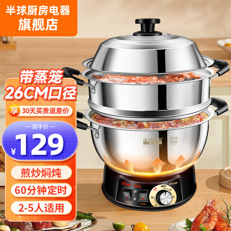 半球(PESKOE) 多功能锅多用途锅电炒锅电蒸锅电煮锅加厚食品级不锈钢电炖锅电火锅炒菜锅大功率 2.6L 26cm带蒸笼定时款(适用2-5人)