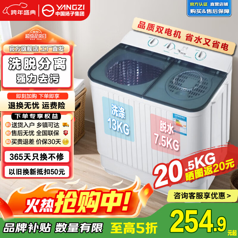 扬子集团洗衣机半自动老式家用双桶大容量双缸洗衣机蓝光 洗脱双筒小型波轮 20.5KG【洗13+7.5脱透明面板强电机】 双缸