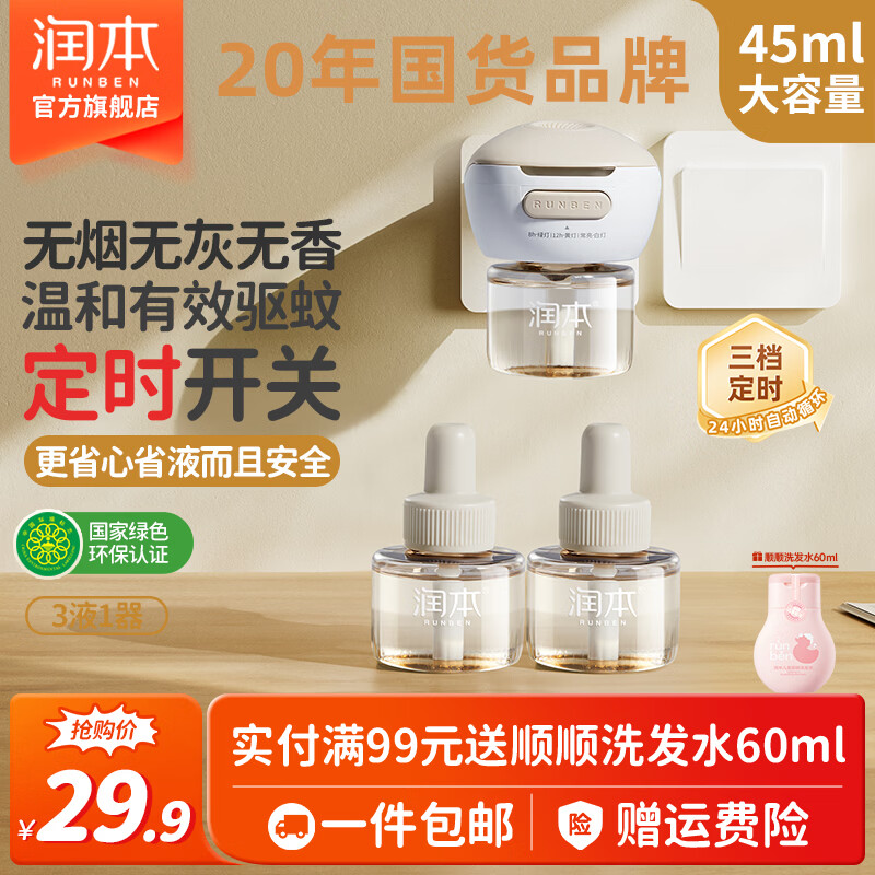 润本电热蚊香液无香定时蚊香器电蚊香补充液防蚊水家用驱蚊液蚊怕水 【3档定时-新客优选】无味3液+1器