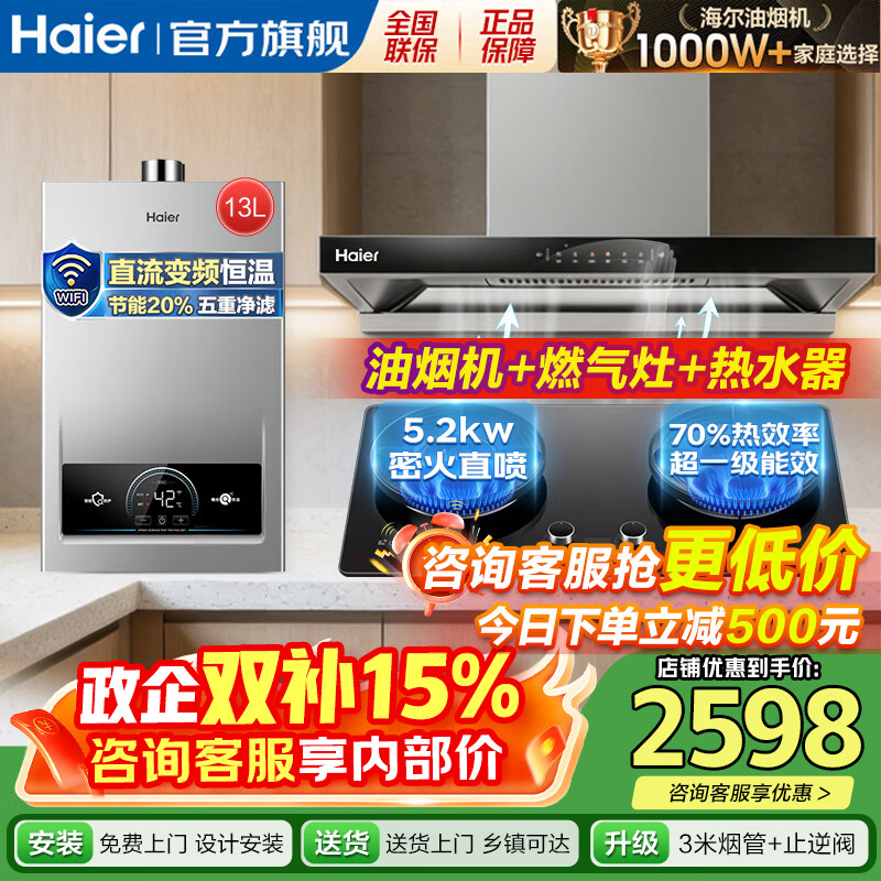 海尔油烟机欧式顶吸26风量大吸力家用一级能效自清洗抽吸排油烟机燃气灶具两三套装以旧换新上门安装 【三件套】油烟机+新一级灶+13升热水器可联网