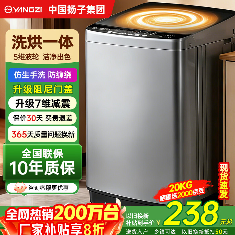 YANGZI扬子集团大容量波轮洗衣机全自动蓝光智能预约强力风干自清洁宿舍家用洗衣机洗烘一体小型甩干机 20KG洗烘一体【强力去污+10年质保】 波轮