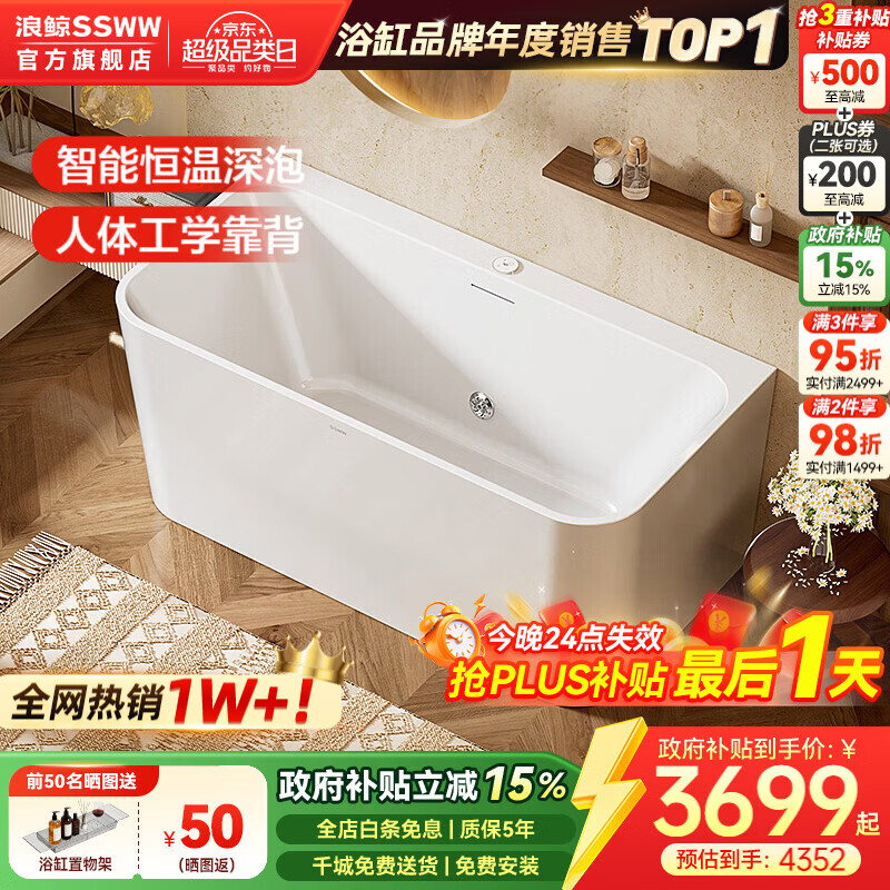 浪鲸(SSWW) 卫浴家用成人亚克力方形浴缸无缝一体泡澡浴缸含下水器0220鲸沐 【1.5m空缸】配恒温款-定制周期约30天
