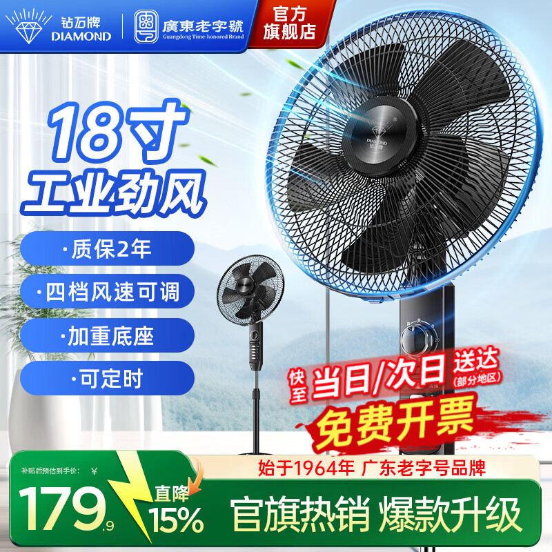 钻石牌(DIAMOND)电风扇落地扇家用风扇立式大风力客厅宿舍五叶扇轻音节能劲风远距电扇可定时SN 18寸强风四档【可定时】