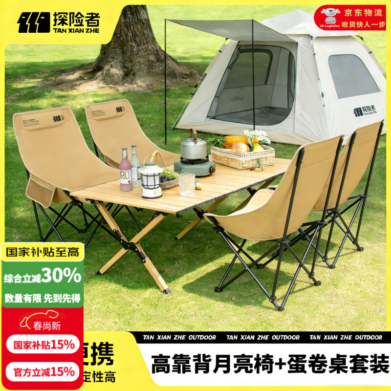 探险者月亮椅户外折叠椅露营椅子高靠背便携高背钓鱼野餐沙滩桌椅全装备 【89%经典选择】经典卡其*4+120木色蛋卷桌