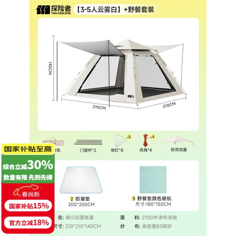 探险者(TAN XIAN ZHE)帐篷户外露营防雨过夜3人-4人速开便捷天幕二合一黑胶防晒帐篷 【3-5人云雾白】+野餐套装