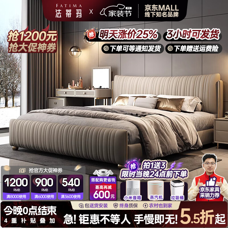法蒂玛现代简约轻奢贝壳真皮床主卧室奶油风高端大气双人婚床2026新款 床+七星泰国乳胶床垫 2*2.2米框架结构【厚实稳重】