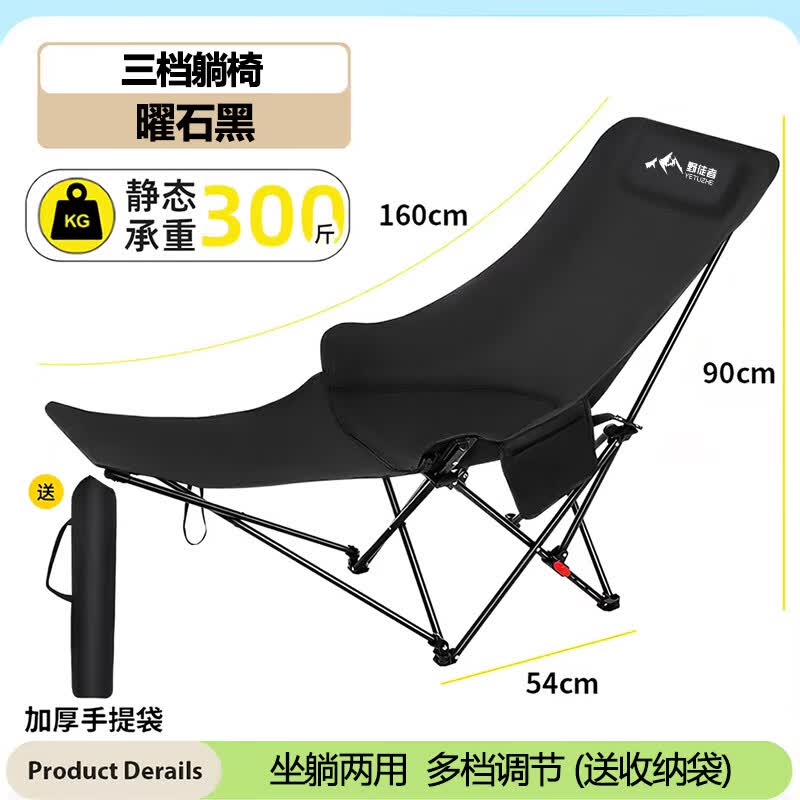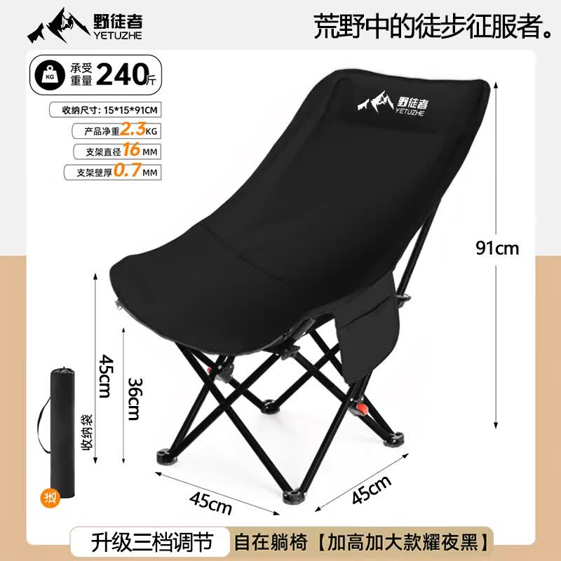 野徒者户外折叠椅露营椅子躺椅便携折叠月亮椅小凳子折叠凳钓鱼凳 曜石黑【三挡调节】加宽座面 出口质量加粗
