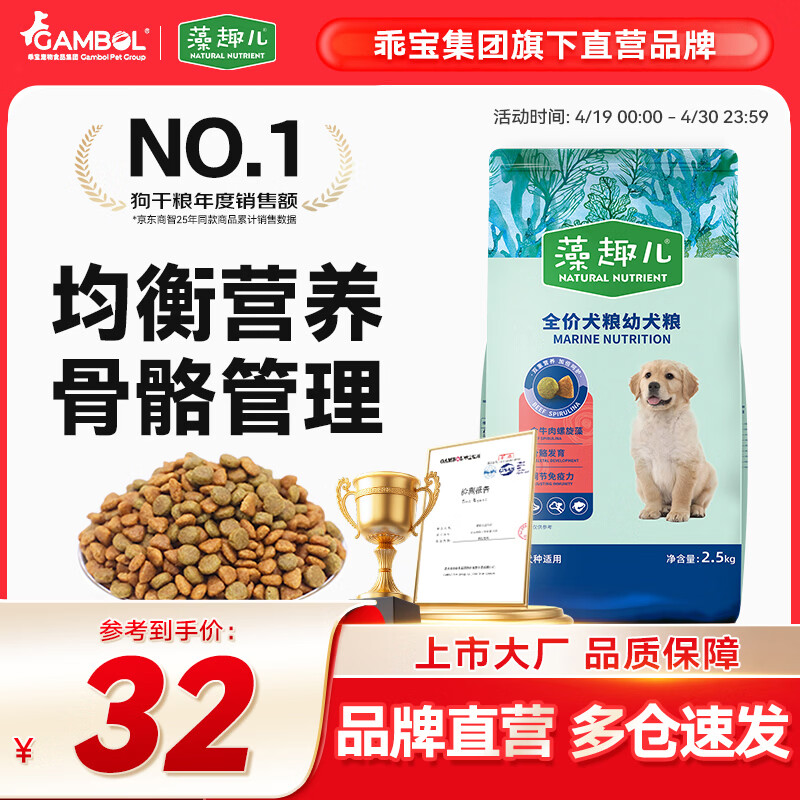 藻趣儿 狗粮 通用全价犬粮小中大型犬泰迪柯基金毛拉布拉多 幼犬粮 2.5kg