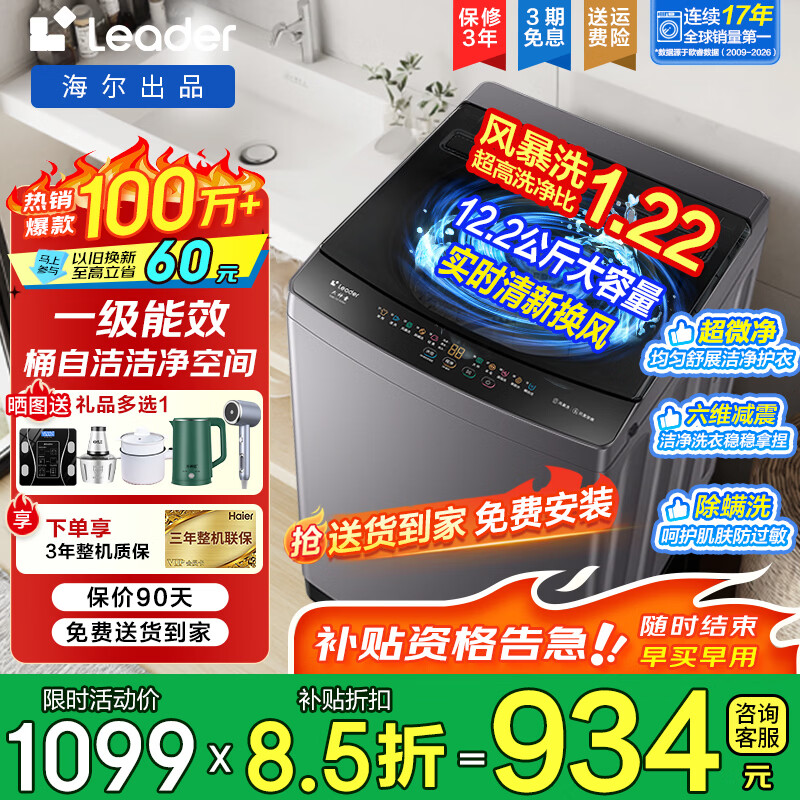海尔(Haier)洗衣机波轮全自动变频一级能效家用大容量除菌洗漂甩二合一智能预约桶自洁统帅以旧换新家电补贴 大神童一级能效+除螨洗+风暴洗 波轮 12.2kg