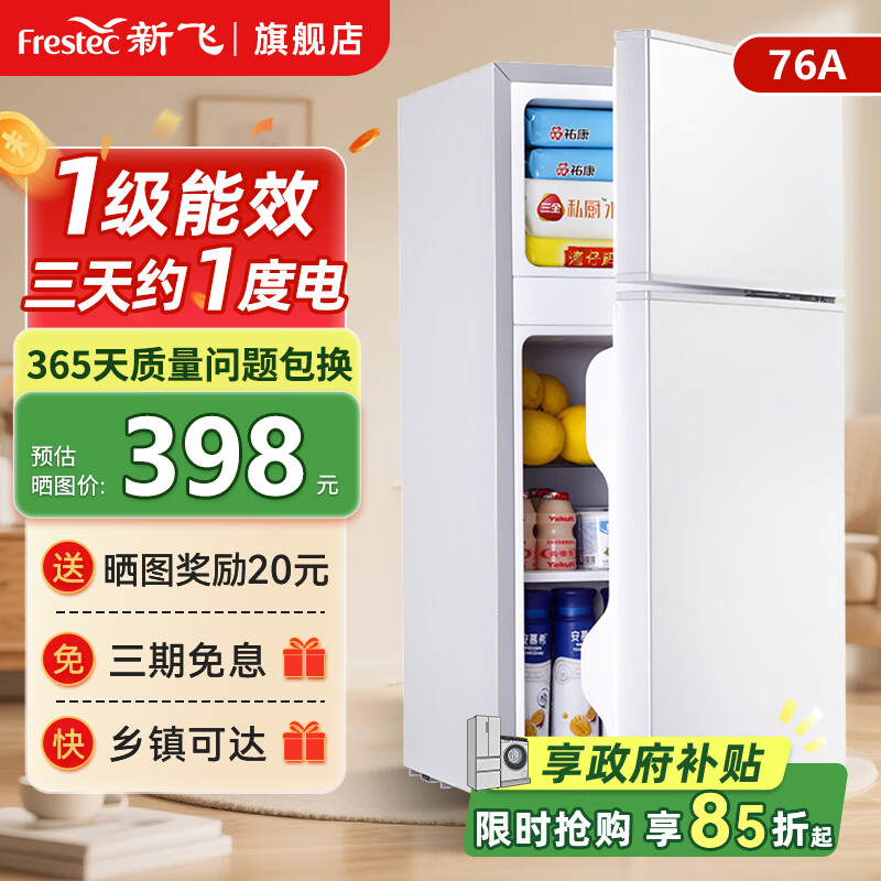 新飞冰箱小型租房用 一级能效冷 藏冷冻两用1-2人家用小冰箱 出租房双门电冰箱办公室两门 26年升级 76A一级能效【保温升级】白