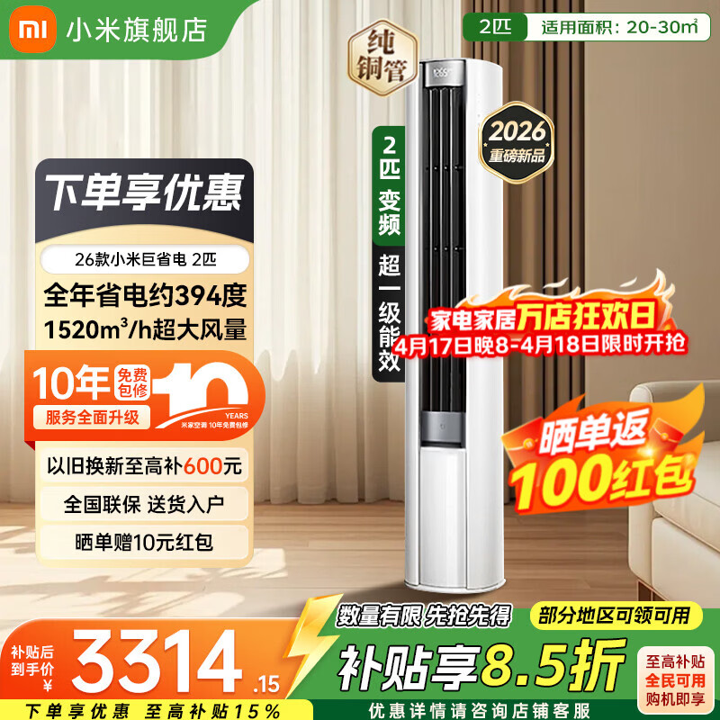 小米(MI)空调3匹 巨省电Pro 大风口柜机 新一级能效 变频冷暖 智能自清洁客厅柜机圆柱式立式空调 十年质保 巨省电大风口 2026款 大2匹 双排铜管