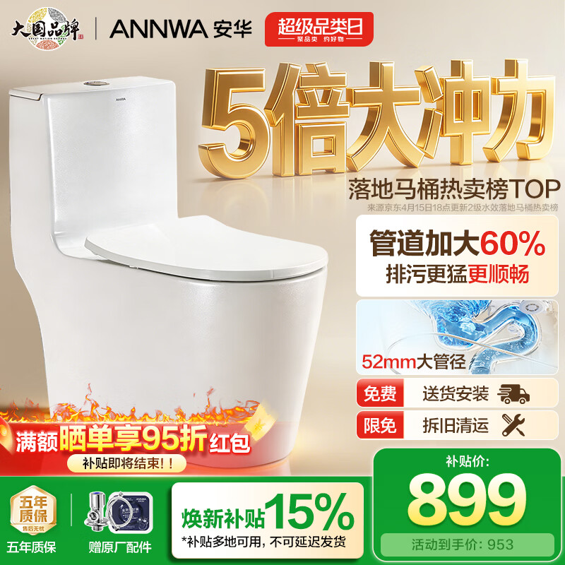 安华大口径家用马桶虹吸式大冲力落地普通防臭坐便器NL317-GM 305坑距