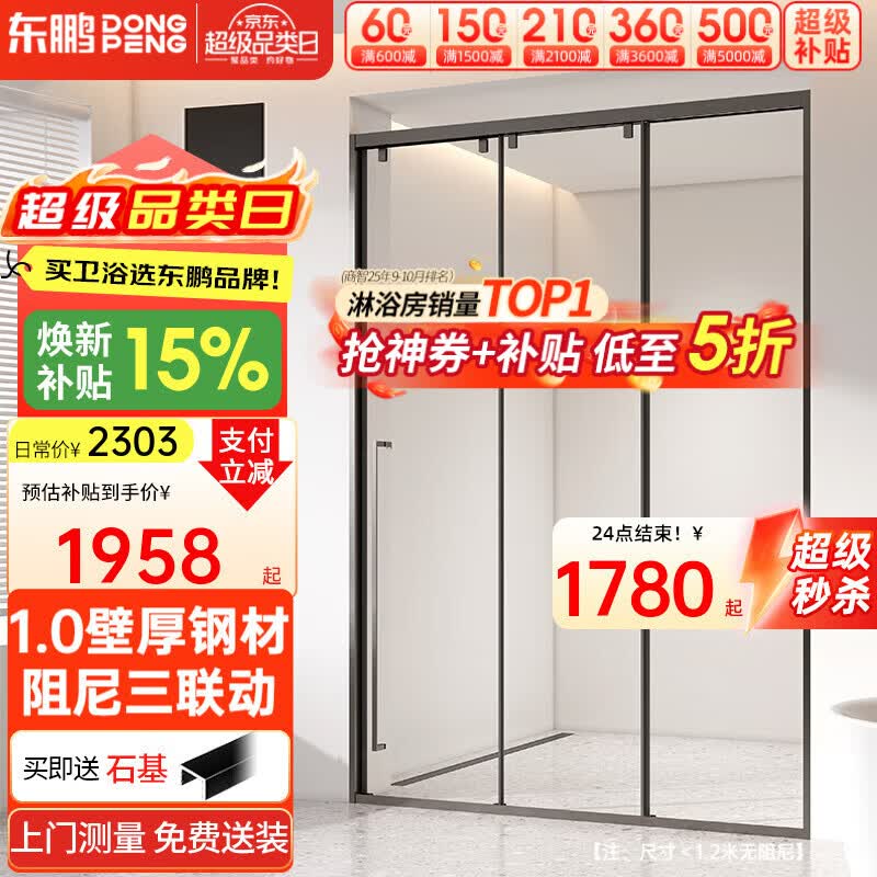 东鹏(DONGPENG)淋浴房三联动推拉门一字形卫生间隔断干湿分离玻璃浴室隔断沐浴房 雅黑0.9-0.99/2米高|极窄 升级1.0壁厚不锈钢+2cm极窄边框
