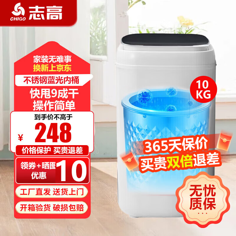 志高【热销Top1】脱水机单甩干脱水机干桶甩干机小型迷你家用甩干桶出租房宿舍大容量脱水桶烘干 10KG黑盖【不锈钢桶加厚款加蓝光】质保三年 波轮