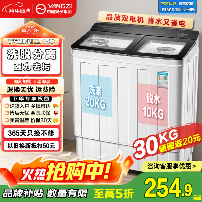 扬子集团洗衣机半自动老式家用双桶大容量双缸洗衣机蓝光 洗脱双筒小型波轮 30KG【洗20+10脱|洗脱分离|玻璃面板】 双缸