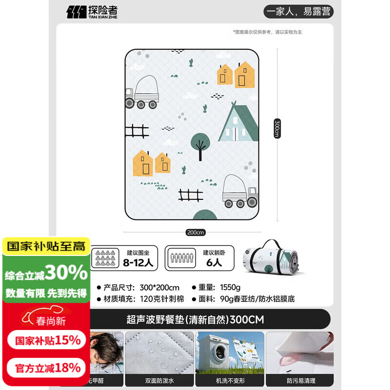 探险者(TAN XIAN ZHE)野餐垫户外加厚超大便携露营垫春游野炊草坪地垫防水防潮垫爬行垫 【7层加厚不硌人】清新自然200*300cm【厚约5mm】