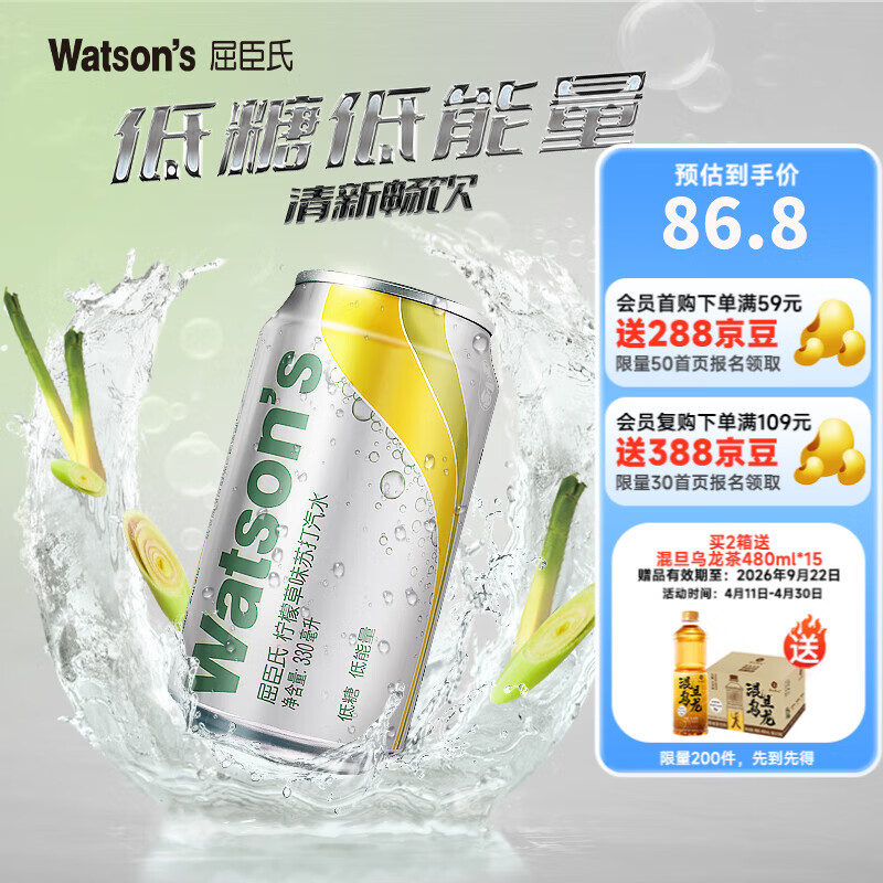 屈臣氏(Watsons)苏打汽水 气泡水 特调饮料 330ml*24罐 整箱装 聚会饮品 低糖0脂 柠檬草口味