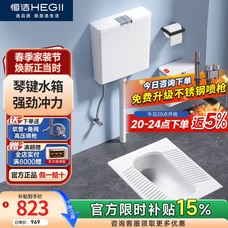 恒洁(HEGII)专利款蹲便器水箱套装超薄防溅防臭卫生间蹲便蹲坑蹲厕大便器3026 3027B蹲便器+6050琴键大冲力水箱套装