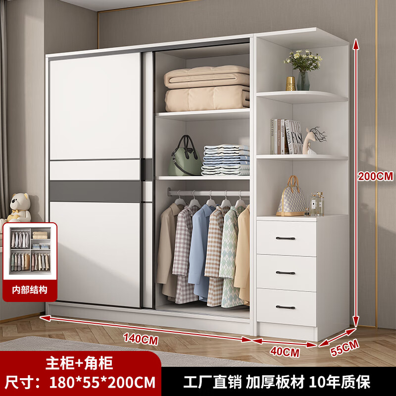 白浅【免费安装】衣柜卧室储物柜子移门衣橱简易推拉门大衣柜 【两门】1.4米主柜+边柜