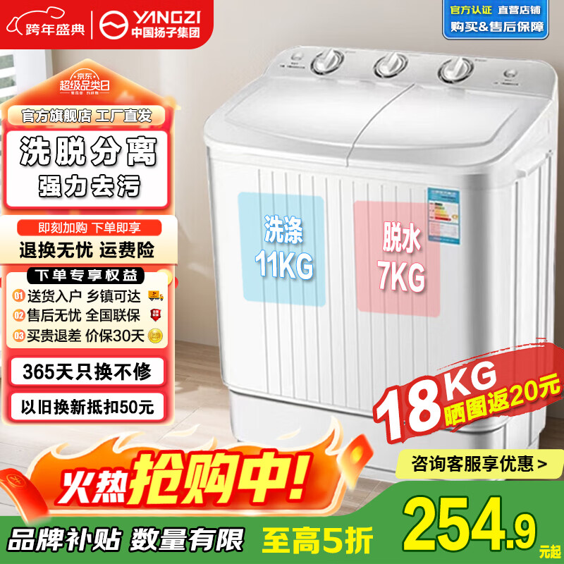 扬子集团洗衣机半自动老式家用双桶大容量双缸洗衣机蓝光 洗脱双筒小型波轮 18KG【洗11+7脱|洗脱分离|强劲电机】 双缸