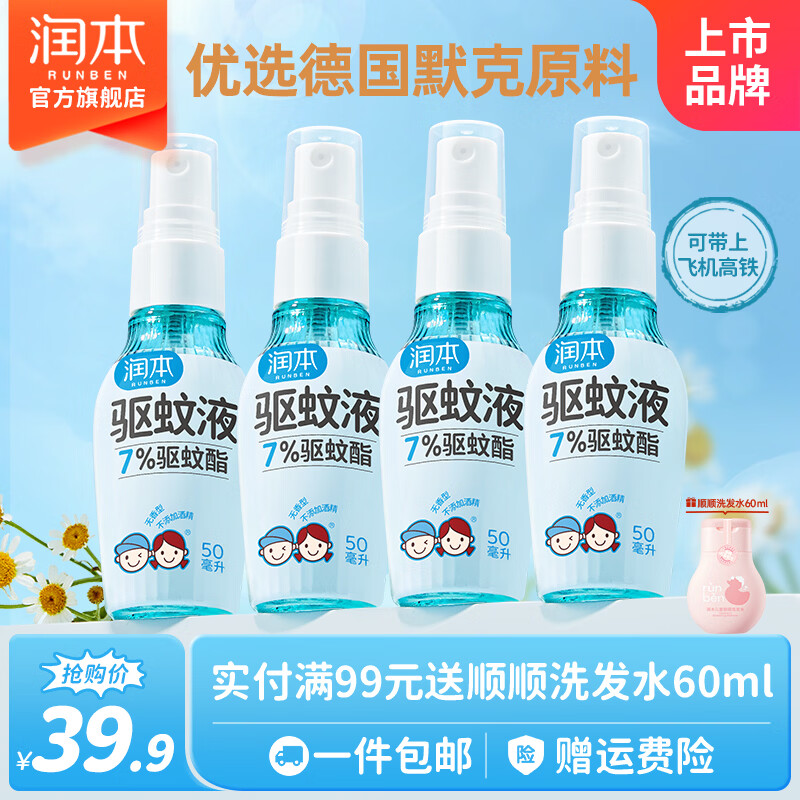 润本驱蚊液驱蚊喷雾防蚊液花露水户外防蚊虫叮咬驱蚊水蚊怕水防蚊喷雾 50ml 4瓶 【户外驱蚊分享装】