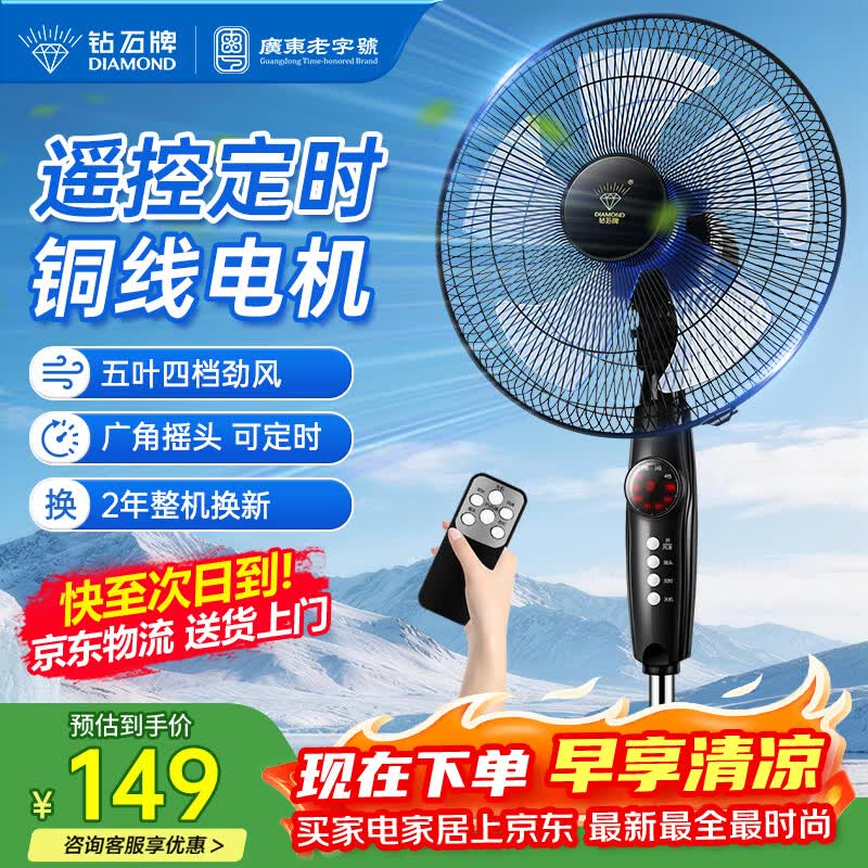 钻石牌落地风扇电风扇落地扇摇头定时家用多档调速机械/遥控风扇强劲大风力摇头定时 14寸五叶劲风速凉(遥控铜线)